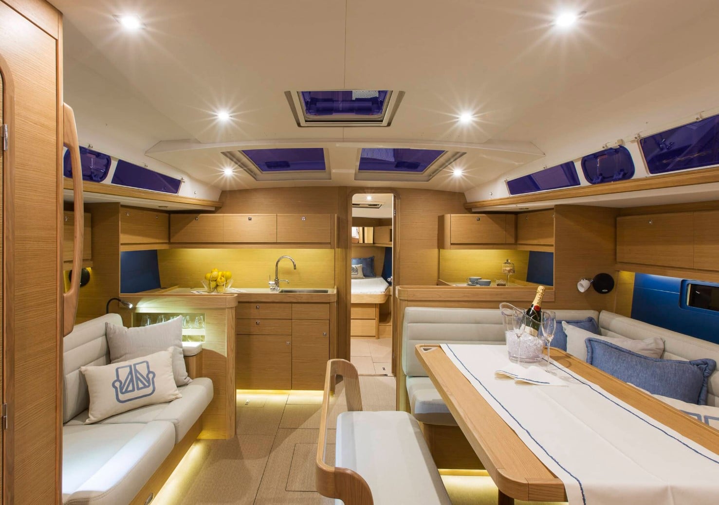 De Dufour 46 combineert elegant design met comfortabel en stabiel zeilgedrag. De ruime cockpit en het lichte, warme interieur zorgen voor ontspanning en gebruiksgemak aan boord. Een zeiljacht dat uitnodigt om te genieten van het zeilen en het moment op zee.